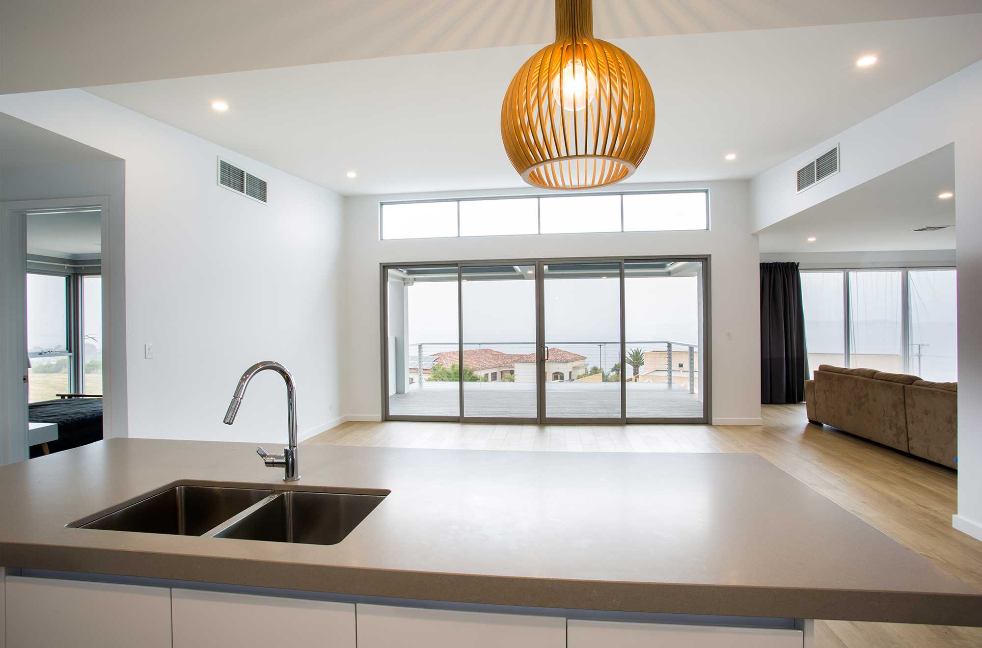 The modern design of this home, and its calming colour palette, captures water views in a way that creates a feeling of extended space.